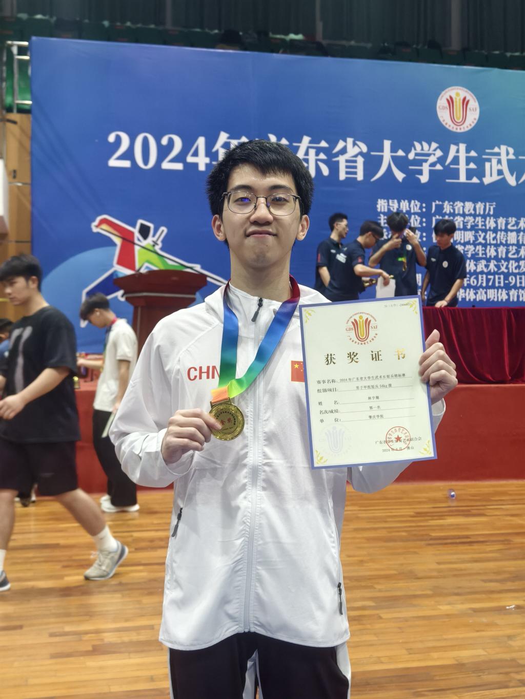 2024年6月12日,在广东省大学生长短兵锦标赛上,世界杯平台22级计算机科学与技术2班林宇翔同学以出色的表现赢得了冠军,并以此见证了个人的成长与团队精神的力量。面对开赛前的紧张,他坦言心情“像是心梗的感觉”,但学会了在紧张中寻找平静,不被情绪左右,从而赢得了比赛的第一课。在比赛过程中,他多次遭遇逆境,但都以坚韧不拔的态度战胜了困难。在半决赛中,他面对身材优势明显的对手,仍然展现出了技术和意志的强大,最终成功晋级。最终,他在决赛中与去年的冠军一决胜负。面对强劲的对手,他没有被压力击垮,而是将其视为检验自我极限的机会。经过激烈的比拼,他以出色的表现夺得了冠军,成为了新一届的王者。
