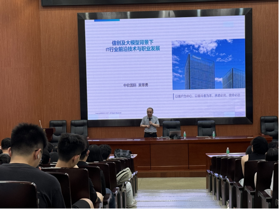 会上,吴章勇博士结合信创及大模型背景下的行业实践,向学生分享了IT领域前沿技术动态与职业发展规划,并从企业用人角度分析了IT领域相关岗位的技能应用要点,为学生后续的实习和就业指明了方向。