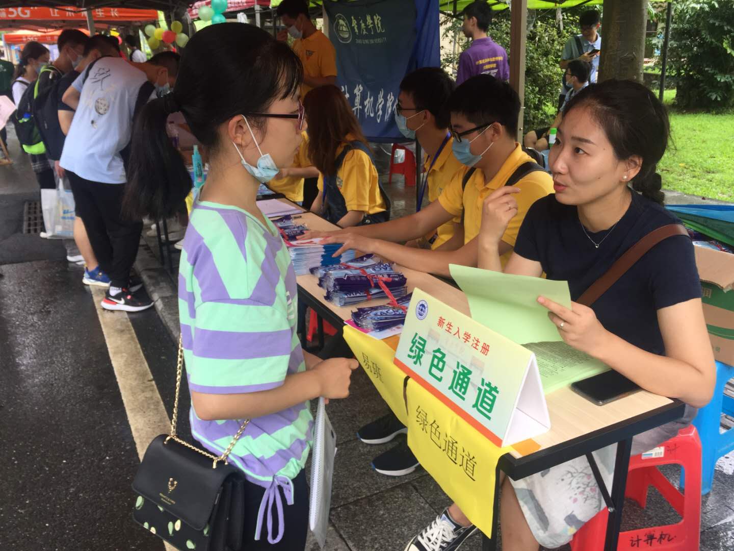 为迎接2020级家庭经济困难学生,使其顺利入学,世界杯平台于9月19日在计算机科学与软件学院、大数据学院2020级新生迎新接待点设立“绿色通道”办理点,展开“绿色通道”送温暖活动。