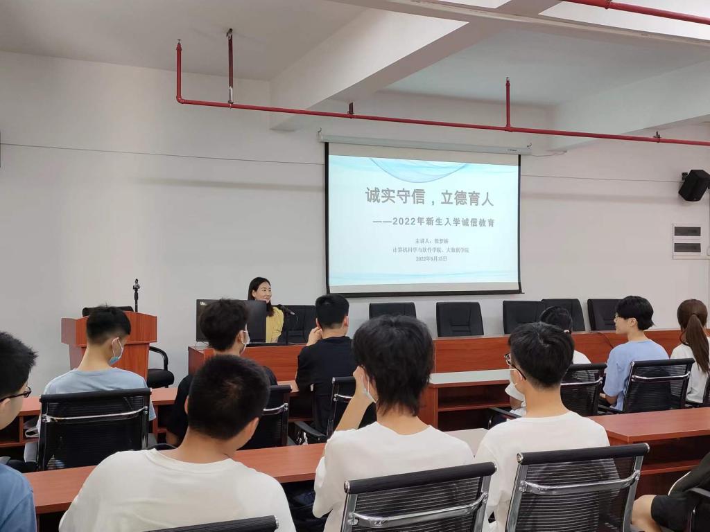 为了深入培育践行社会主义核心价值观,大力弘扬诚实守信的中华传统美德,坚持立德育人根本任务,发挥诚信精神在新时代的教育引导作用,增强学生的诚信意识,培养学生的诚信品质,计算机科学与软件学院、大数据学院于2022年9月15日在实训大楼315会议室举办以“诚实守信,立德育人”为主题的新生入学诚信教育会议。