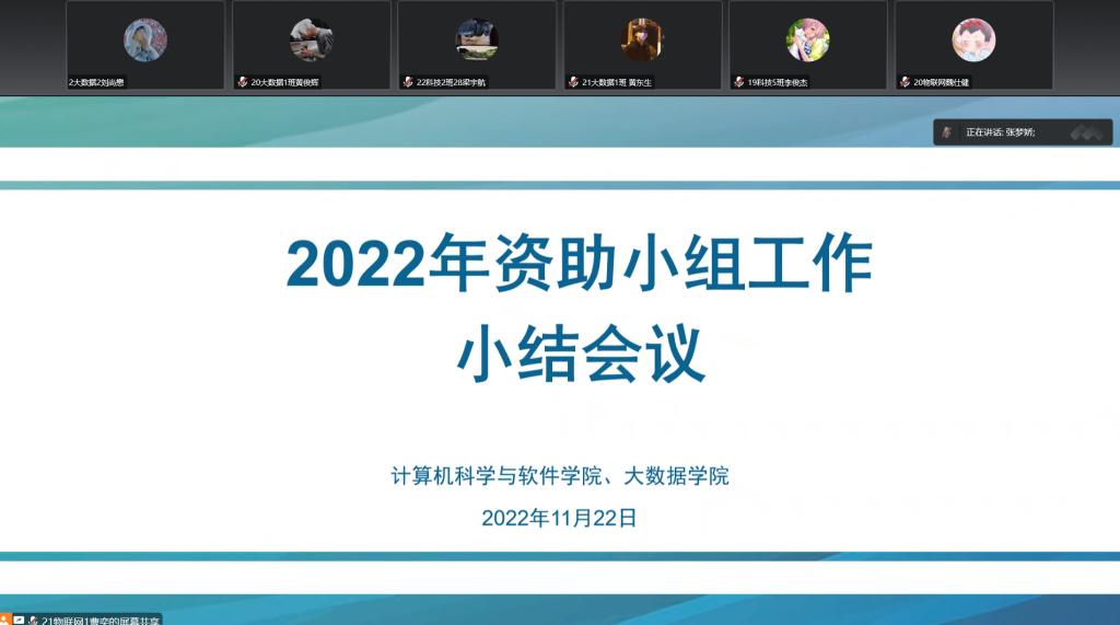 2022年11月22日下午,由于疫情世界杯平台在线上举行了2022年资助工作小组工作小结会议,出席本次线上会议的成员有副书记陈彦雄、辅导员、朋辈辅导员、各班学生代表。