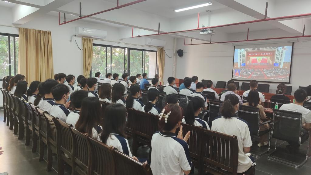 16日上午9:40,与会同志就座在分会场怀着激动的心情等待大会开幕。随着主持人宣布大会开幕,到会师生与现场直播同步,全体起立,高唱国歌。开幕会历时2个小时,习近平总书记的报告激荡群情、催人奋进。全场师生代表全程认真聆听、当习近平总书记报告结束时,大家也随着现场代表们一起长时间热烈鼓掌,表达对这次团结、胜利、奋进的空前盛会的祝贺,表达对总书记的高度信赖、坚决拥护和衷心爱戴。