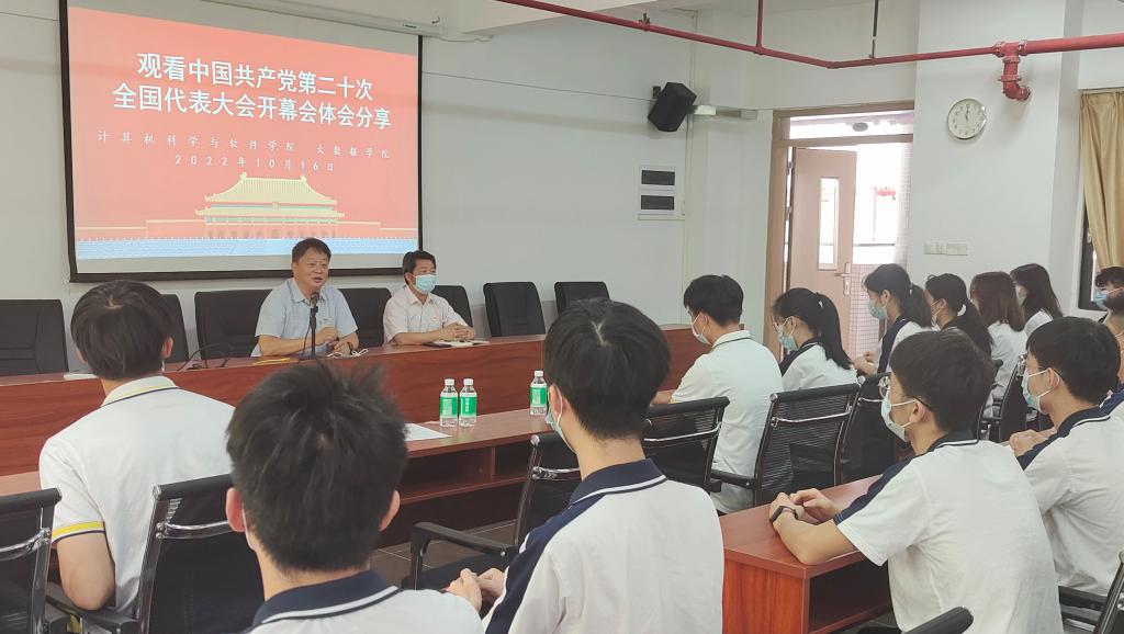 10月16日上午10时,中国共产党第二十次全国代表大会隆重开幕。计算机科学与软件学院、大数据学院党委委员、领导班子成员、团委书记、党支部书记、辅导员、师生党员代表、教师党外人士及团员代表共计105人集体观看了开幕会现场直播盛况,认真聆听了习近平总书记代表十九届中央委员会向大会所作的报告。大家精神振奋,热情高涨,学院设的分会场党员活动室、会议室座无虚席。