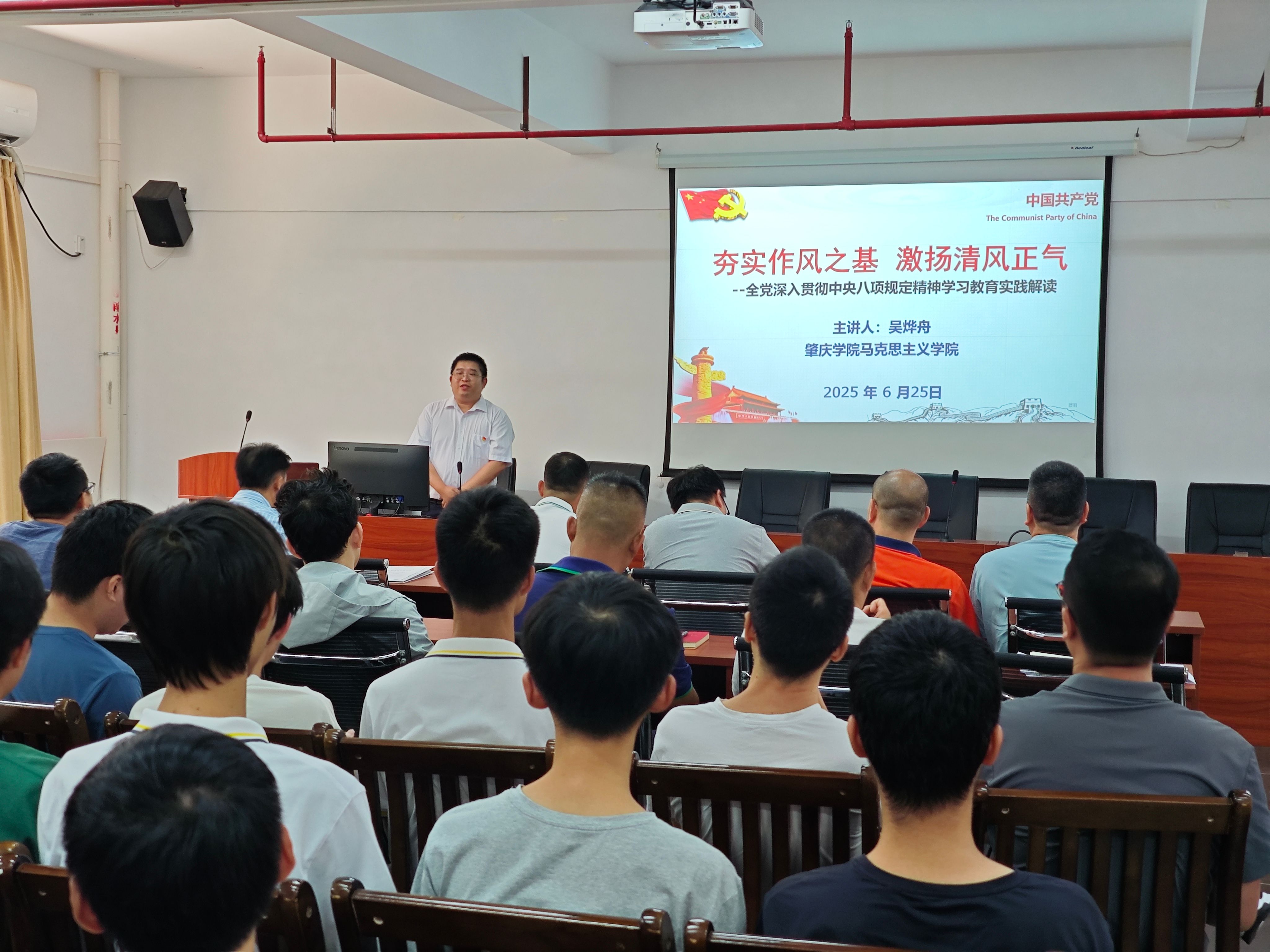 6月25日下午,计算机科学与软件学院在实训大楼315会议室举办深入贯彻中央八项规定精神学习教育专题宣讲会。大会邀请肇庆学院宣讲团成员、马克思主义学院“大学生军事理论课程”教学部主任吴烨舟博士授课。学院领导班子成员、全体教师党员和学生党员代表共60多人参加。会议由学院党委副书记陈彦雄主持。